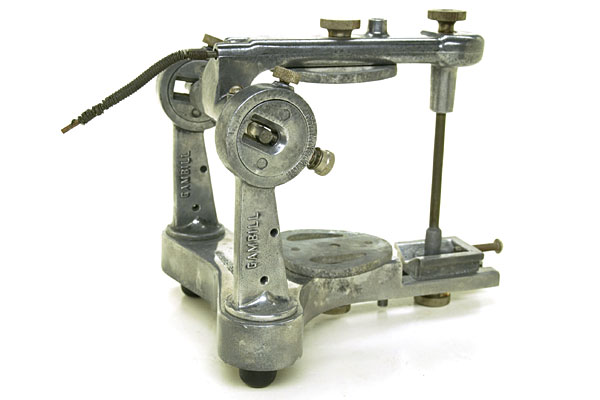 The Gambill Articulator is a non-arcon, semi-adjustable instrument with condylar controls designed very much like the Hanau H 2; that is, the condylar balls are on the upper member and adjustable straight closed slots are on the lower member. There is provision for adjusting the progressive Bennett movement by turning the vertical condylar posts. The principle feature of this articulator is an incisal pin and guide milling device for "grinding-in" denture occlusion. This device consists of a revolving incisal pin with a horizontal cam that that revolves within a V-shaped trough incisal guide. The purpose of the horizontal cam on the incisal pin rotating within the V-shaped incisal guide is to provide combined vertical and oscillatory movements. There is no doubt that this feature would produce a bumping action. The rotary movement of the incisal pin is operated by a worm gear and pinion located in the upper member of the articulator. It is activated by means of a flexible twist shaft extending from the rear of the upper member to a power source. There is an anterior adjusting screw in the incisal guide trough to provide for "long centric."
