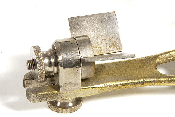 Detail of incisal guide. Unlike the Gysi that had a fixed protrusive angle only, the Wadsworth had a fixed flat protrusive and adjustable lateral wings.