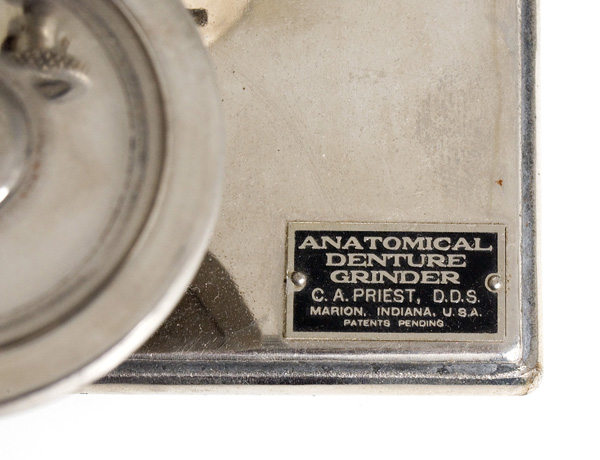 The Priest Grinder was intended to accommodate many of the most popular semi-adjustable articulators of the day, such as the Hanau H (pictured) and the Wadsworth. The power source for the grinding assembly was probably a bench lathe attached to the large pulley wheel. The grinding assembly attaches to the incisal pin producing a horizontal elliptical motion. The condylar and incisal controls are preset and provide the “anatomical” component of the motion.