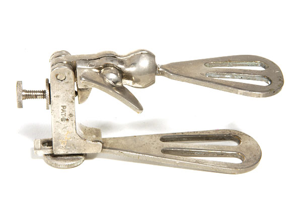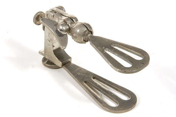 This crown and bridge articulator is a simple hinge device. It's features include a posterior vertical stop and a ball-joint section on the maxilla cast holder for ease of relating sectional casts. This articulator came in large and small sizes. This articulator is the small version, being---"high and ---" long.
